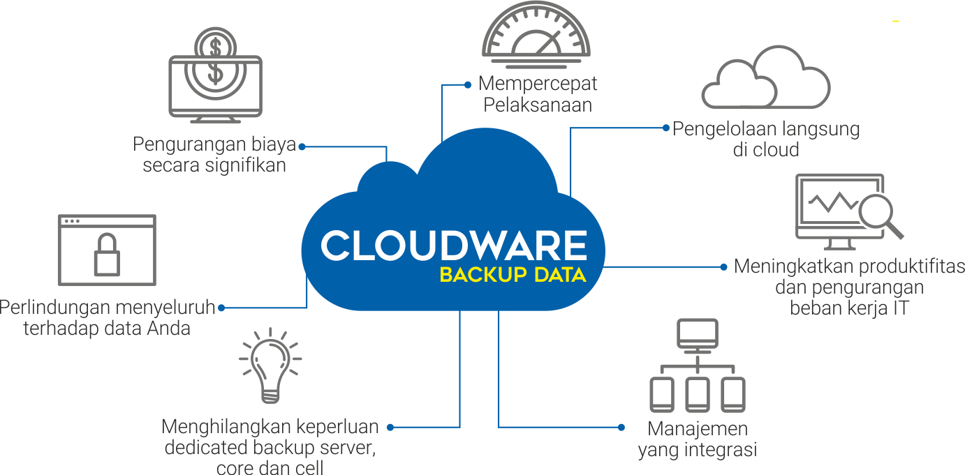 Solusi backup data bagi perusahaan yang membutuhkan keamanan dan kemudahan dalam penyimpanan data. Cloudware - Backup data mampu membackup data file, folder maupun keseluruhan sistem di client dan selalu siap untuk diakses dimanapun dan kapanpun.